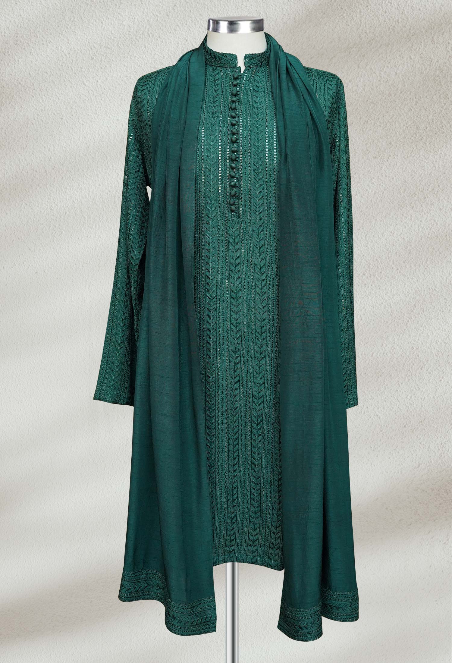 Green kurta for men crafted from korean fabric, featuring a vertical geometric self embroidery pattern and front button detailing. Perfect for engagements, barat, nikkah, and memorable wedding occasions. Place your order today!
