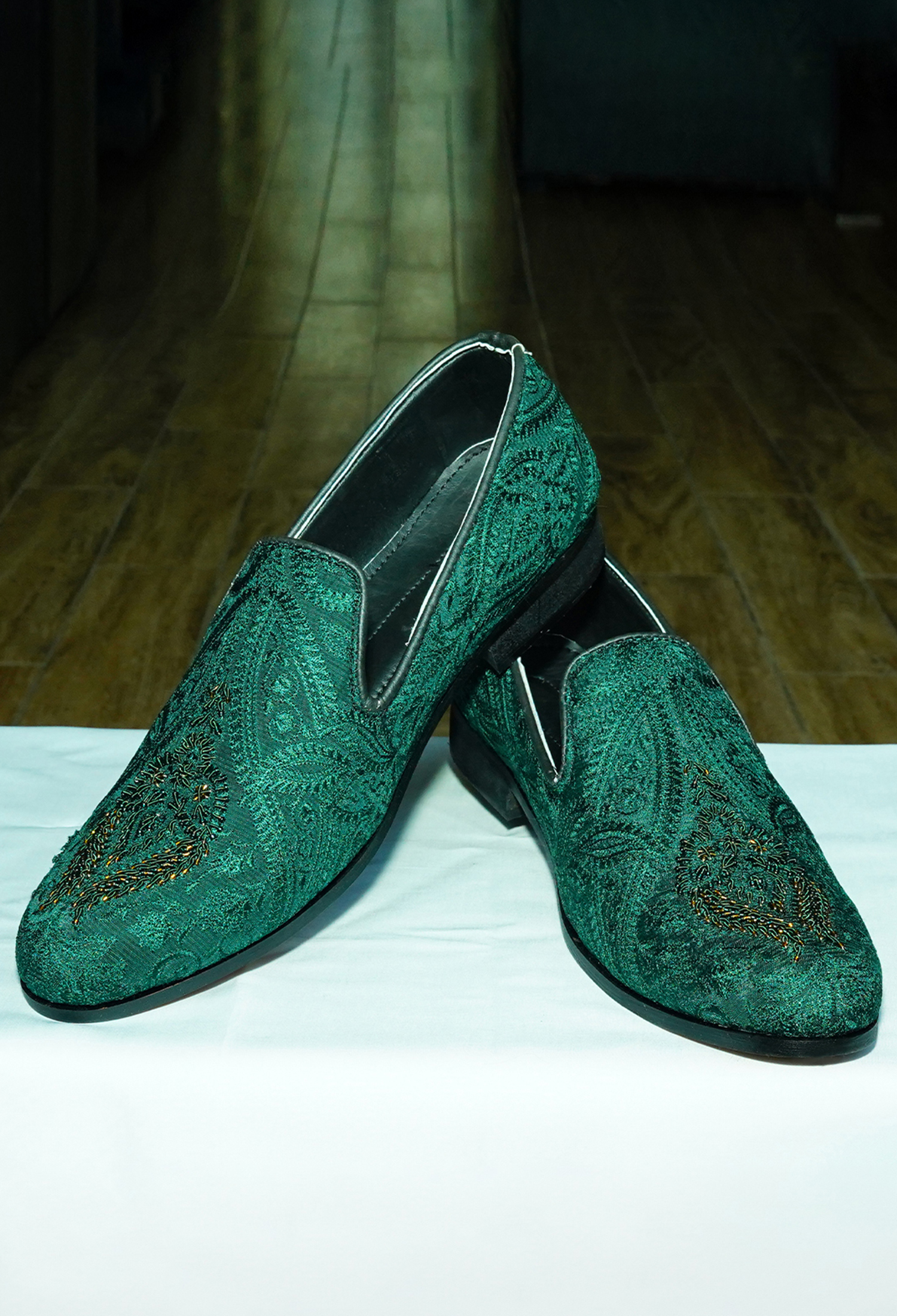 Handmade deep green loafer made from textured fabric with golden and dark green embroidery in a paisley design. These comfortable shoes add a touch of tradition style and a beautiful choice for engagements, barat, nikkah, and other wedding events. Don’t miss out. Order now and make your occasion truly memorable.