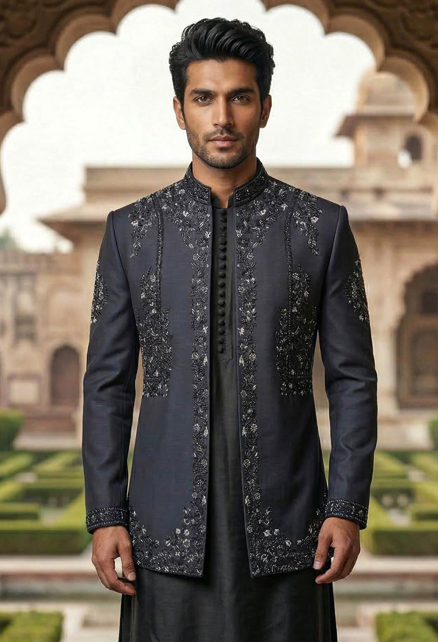Sherwani & Price Suit: Ensure a tailored fit by focusing on the shoulders and chest allowing the Sherwani / Prince Suit to drape elegantly.