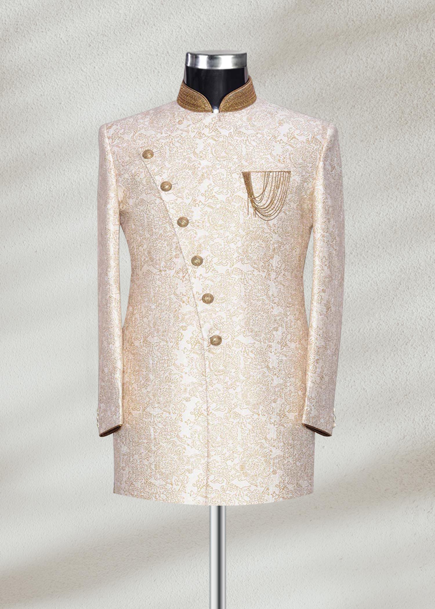 This Men Off White Prince Suit features a sophisticated pocket chain, and six buttons. The jamawar fabric, unique design and stylish touch, making it an excellent choice for weddings and special events. A refined and stylish option for any traditional occasion.