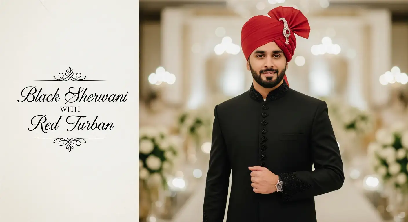 Every groom wants to look his best. But only a few manage to look truly royal. The secret often lies in one classic choice, the black sherwani with red turban.